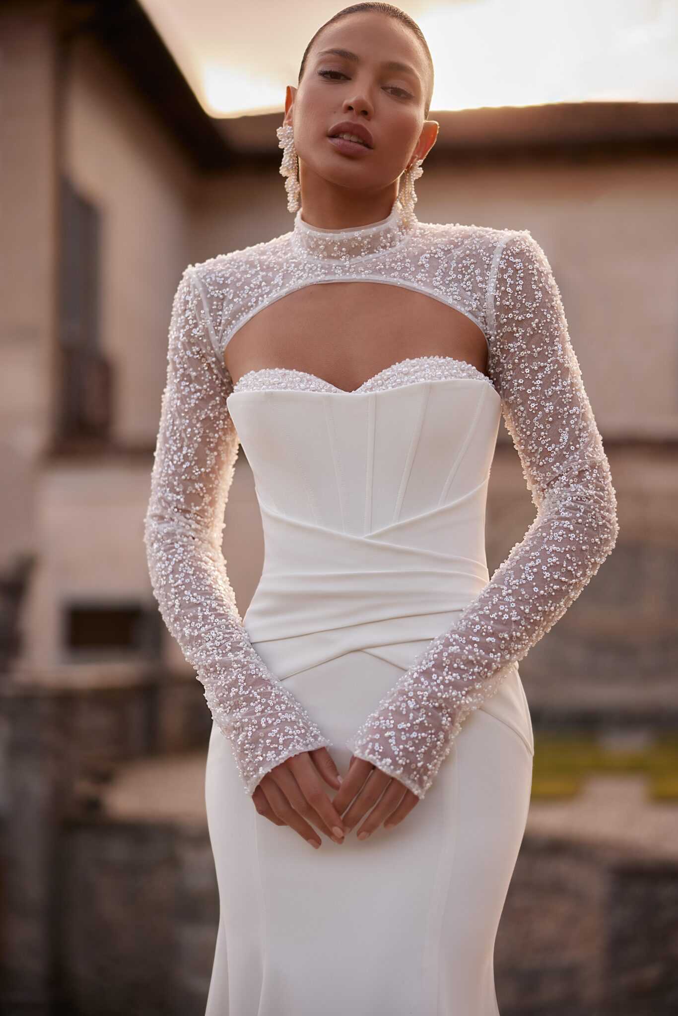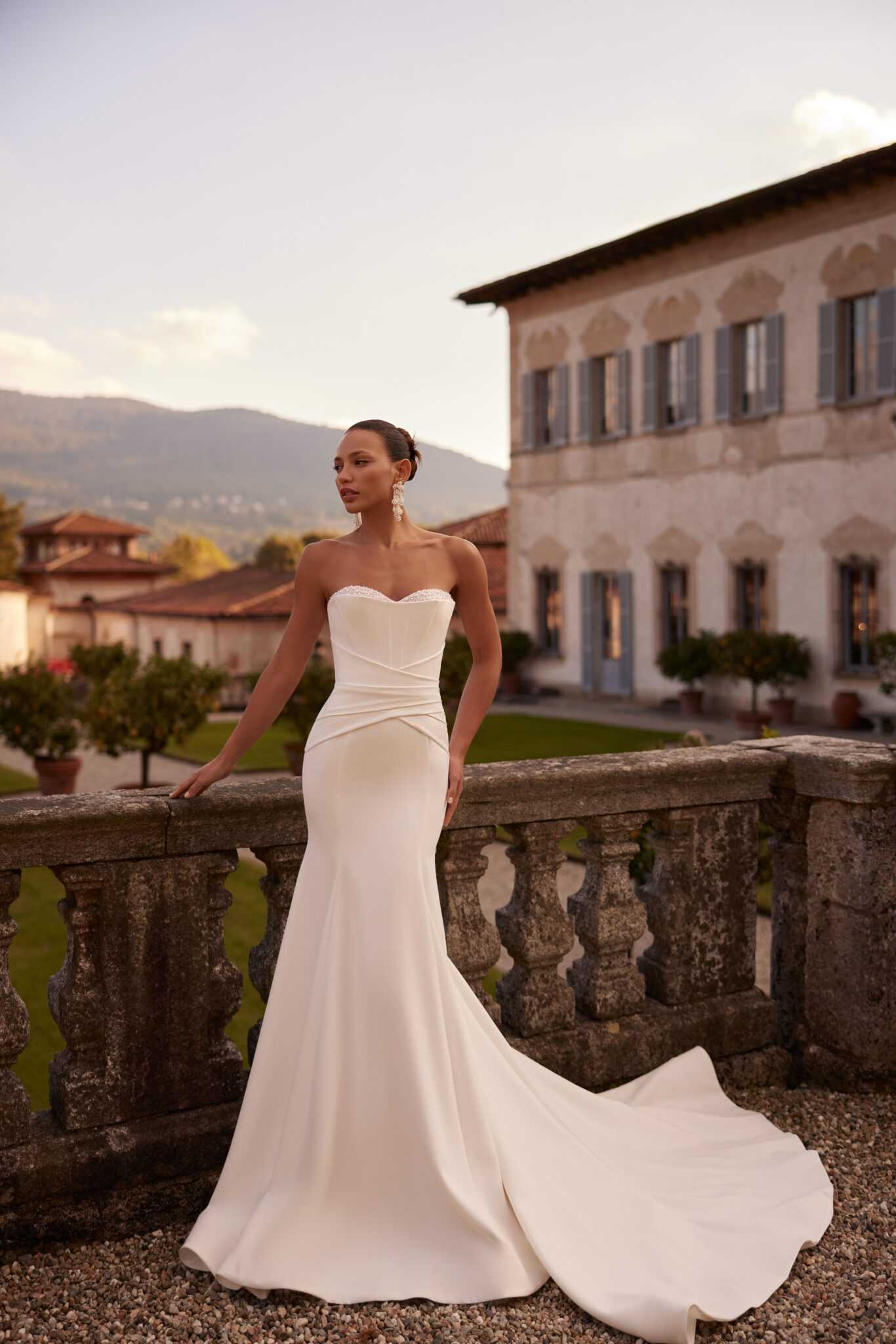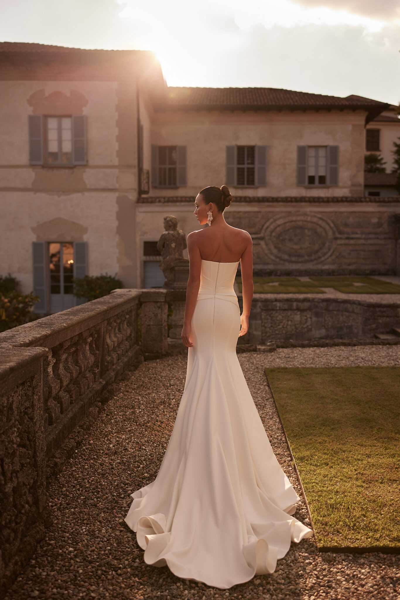 Az elegancia, a szépség, a gyengédség és a kecsesség ötvöződik ebben az elefántcsontszínű, sellősziluettű ruhában. A szív alakú nyakkivágású fűző csipkével díszített, kristályokkal és gyöngyökkel hímzett. Az oldalvarrásnál kezdődő, átlós drapéria vizuálisan karcsúsítja a derekat. A felső rész horgos záródással rögzíthető. A csípőnél szorosan illeszkedő szoknya elegáns uszályú, dombornyomott varratokkal.